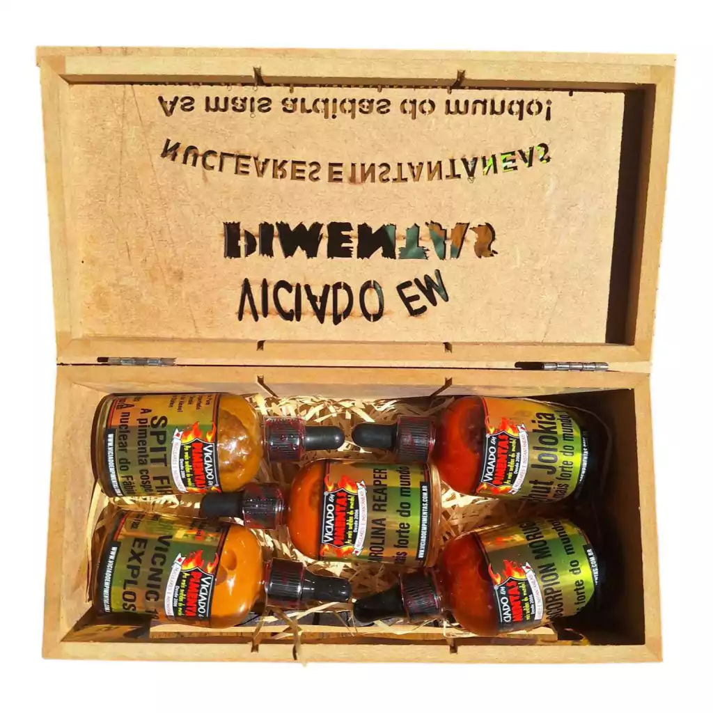 Cada pimenta vem em vidros de 60 ml, permitindo experimentar, dosar e apreciar cada detalhe do sabor e do calor intenso. Além disso, você ainda leva uma caixa em MDF gravada a laser da marca mais famosa do Brasil, Viciado em Pimentas, perfeita para guardar seu kit de forma elegante e segura.